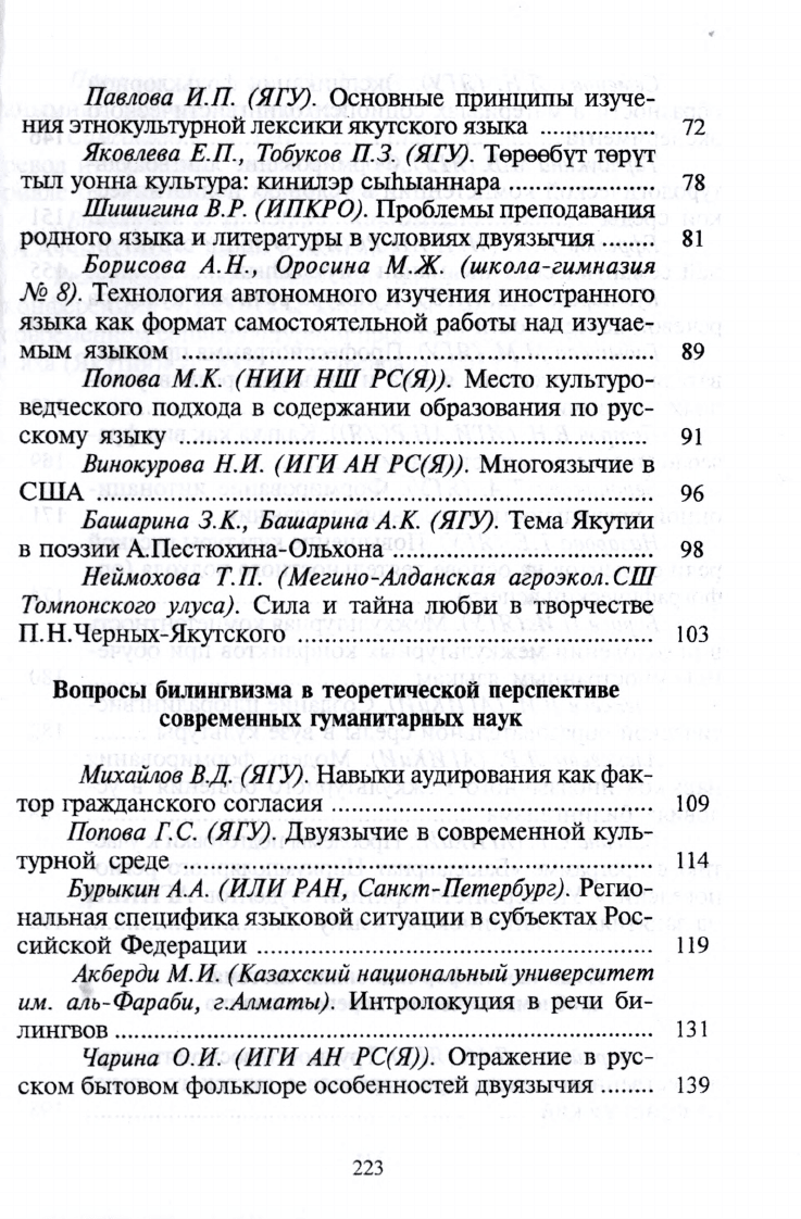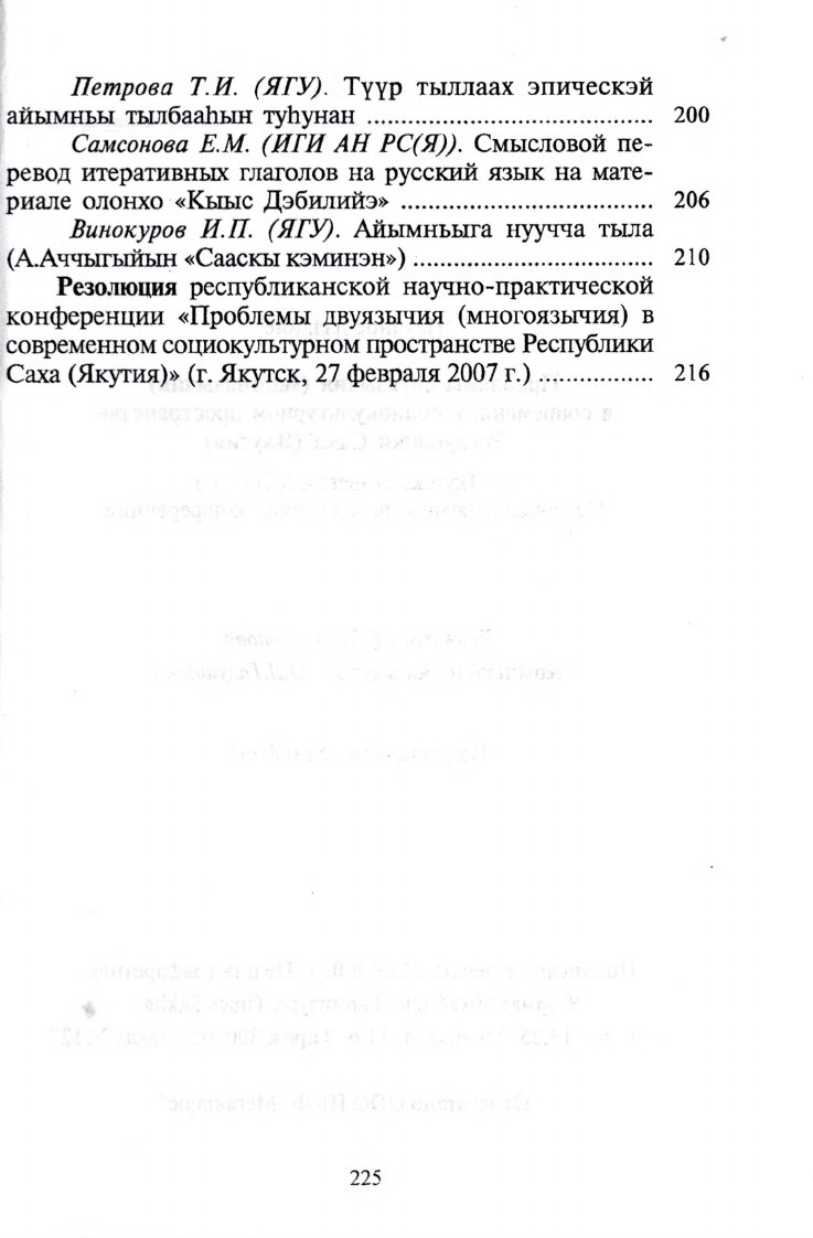 Проблемы двуязычия (многоязычия) в современном социокультурном пространстве (г. Якутск, 27 февраля 2007 г.) : материалы научно-практической конференции / [ответственный редактор П. А. Слепцов ; редакционная коллегия: Н. И. Иванова, Л. Н. Семенова]. - Якутск : ИГИ АН РС(Я), 2007. - 225 с.