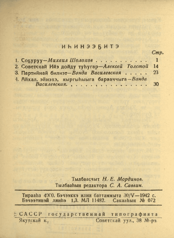 Советскай Ийэ дойду туһугар : [хомуурунньук / тылб. Н. Е. Мординов]. - Якутскай : САССР государственнай издательствата, 1942. - 34, [2] с.