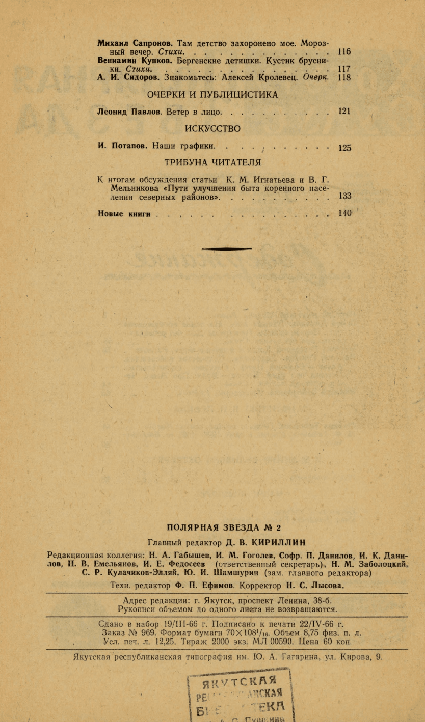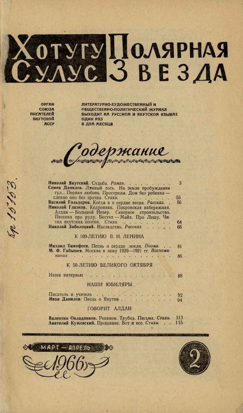 Полярная звезда : литературно-художественный и общественно-политический журнал. - Якутск : [б. и.], 1956-. - 27 см. 1966, N 2, март-апрель. - 1966. - 139, [1] с.