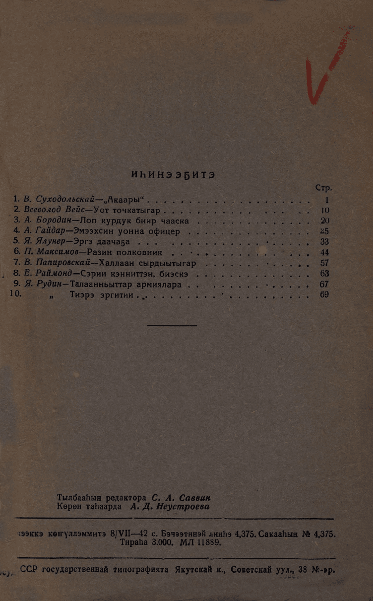 Биирдии көстүүлээх пьесалар. - Якутскай : САССР государственнай изд-вата, 1942. - 69, [2] с.