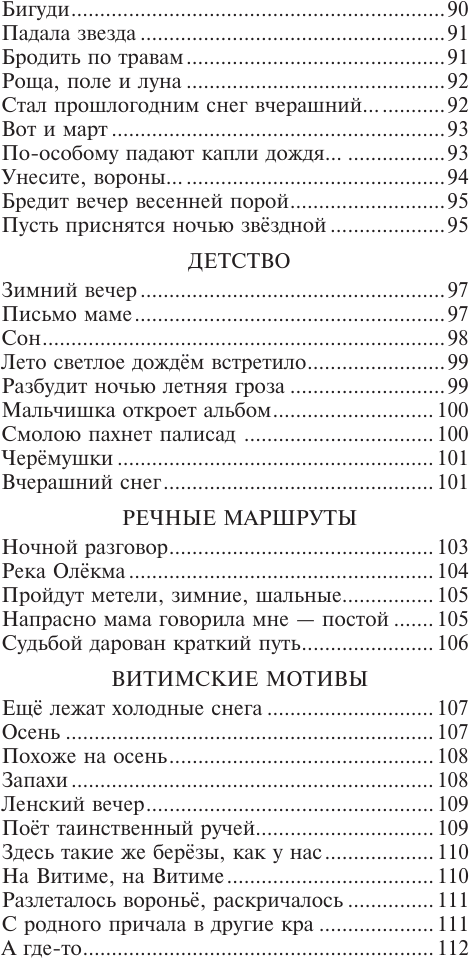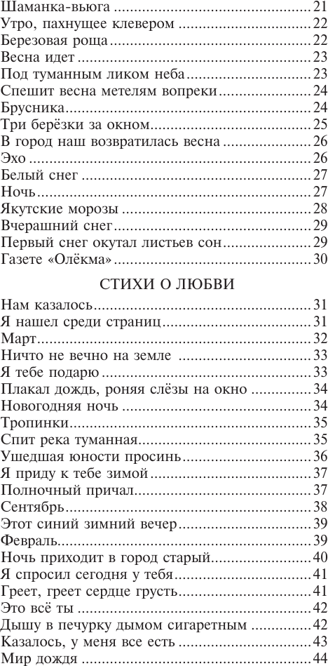 В сборник вошли стихотворения из предыдущих изданий, а также новые тексты о родном крае, Олекминской земле, любви, детстве, шоферской доле, речных мотивах, детские стихи и др. Предназначен для широкого круга читателей