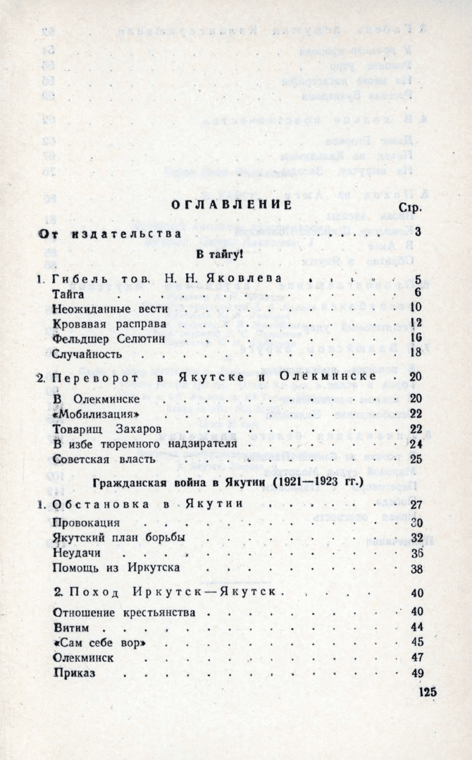 В I главе настоящей книги И. Строда описываются два события: трагическая гибель работников Центросибири во главе с Н. Н. Яковлевым и свержение колчаковщины в Олекминском улусе. Вторая глава книги содержит воспоминания И. Строда о гражданской войне в Якутии в 1921-1922 гг.