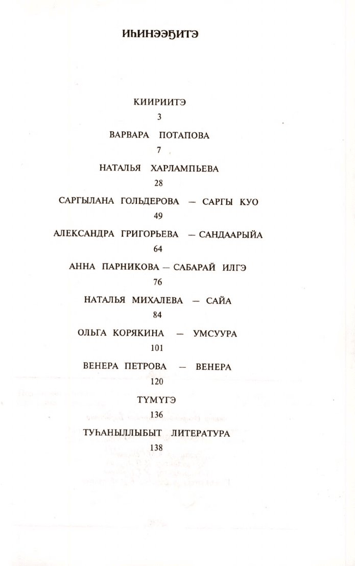 В своей монографии автор анализирует творчество якутских поэтесс - Варвары Потпповой, Натальи Харлампьевой, Саргыланы Гольдеровой-Саргы Куо, Александры Григорьевой-Сандаарыйа, Анн Парниковой-Сабарай Илгэ, Натальи Михилевой-Сайа, Ольги Корякиной-Умсуура, Венеры Поповой-Венера. Исследуется своеобразие стиля их поэзии и вклад поэтесс в развитие современной якутской литературы