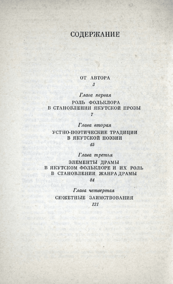 В монографии на основе конкретного анализа прослеживается глубинная связь якутской прозы, поэзии и драматургии с устно-поэтическим творчеством. При всей самобытности и индивидуальной неповторимости творчества якутских писателей, как показывает автор, ясно ощутимы те национальные истоки, которые постоянно обогащают их художественные приемы, язык и стиль их произведений