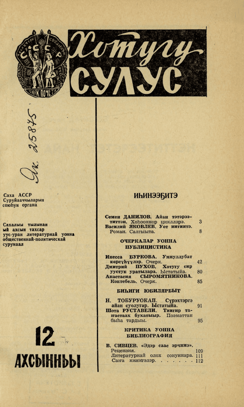 Хотугу сулус : [сахалыы тылынан уус-уран литературнай уонна общественно-политическай сурунаал] / САССР советскай суруйааччыларын союһа. - Якутскай : Саха сиринээҕи кинигэ издательствота, 1940-1989. 1977, N 12. - 1977. - 111, [1] с.
