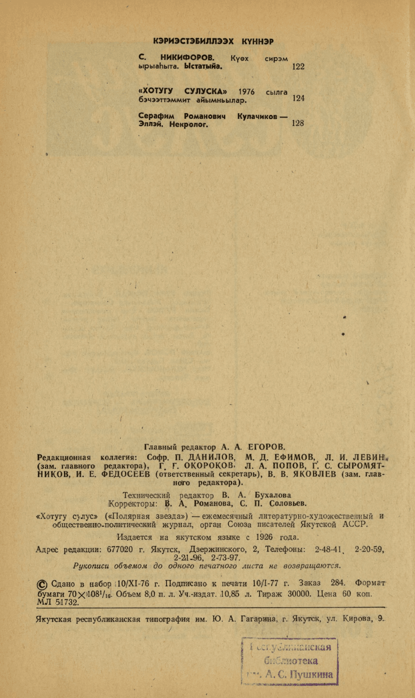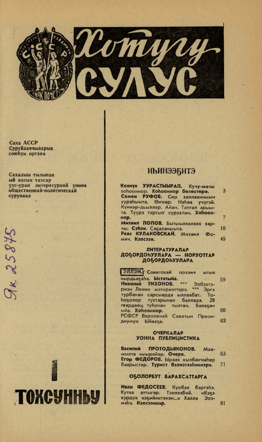 Хотугу сулус : [сахалыы тылынан уус-уран литературнай уонна общественно-политическай сурунаал] / САССР советскай суруйааччыларын союһа. - Якутскай : Саха сиринээҕи кинигэ издательствота, 1940-1989. 1977, N 1. - 1977. - 128 с.