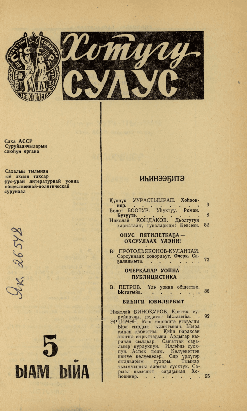 Хотугу сулус : [сахалыы тылынан уус-уран литературнай уонна общественно-политическай сурунаал] / САССР советскай суруйааччыларын союһа. - Якутскай : Саха сиринээҕи кинигэ издательствота, 1940-1989 1978, N 5. - 1978. - 111, [1] с.