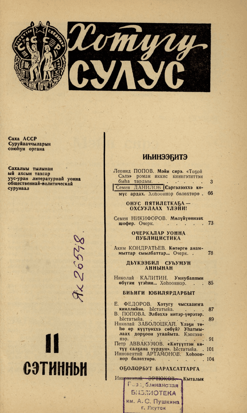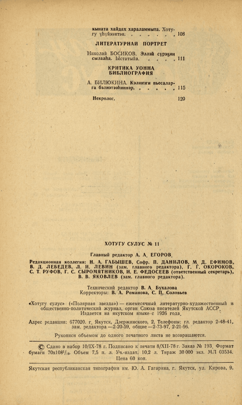 Хотугу сулус : [сахалыы тылынан уус-уран литературнай уонна общественно-политическай сурунаал] / САССР советскай суруйааччыларын союһа. - Якутскай : Саха сиринээҕи кинигэ издательствота, 1940-1989 1978, N 11. - 1978. - 120 с.