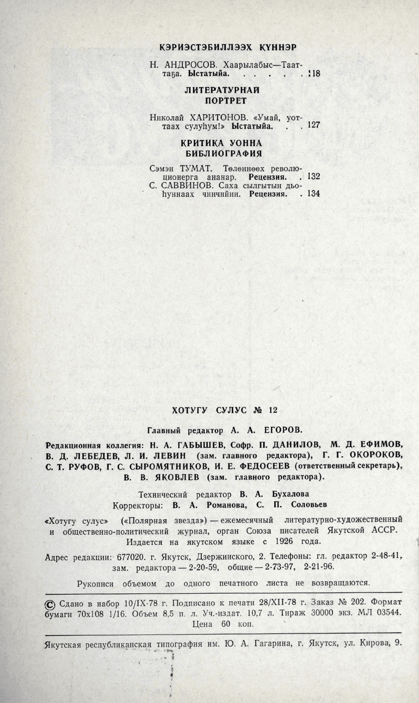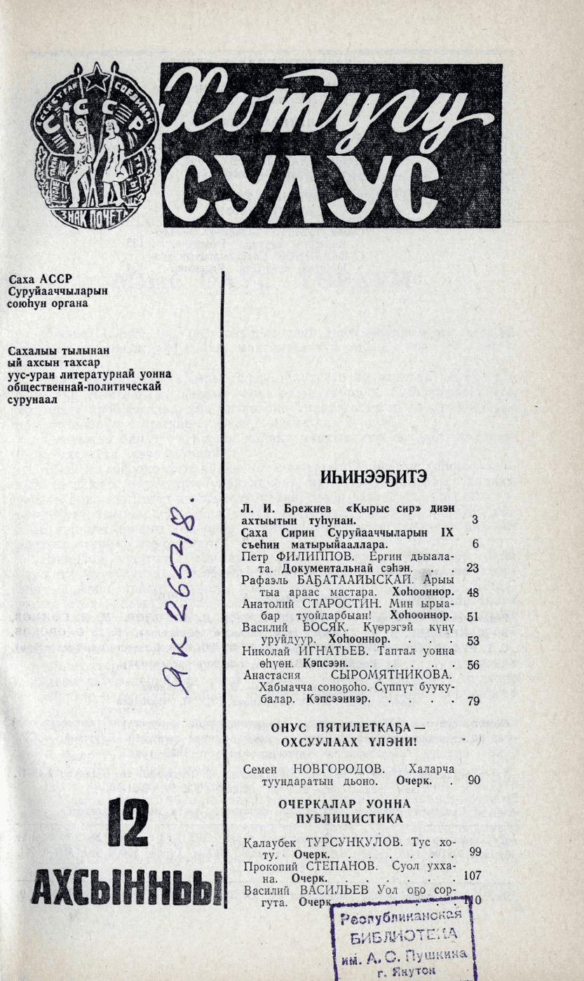 Хотугу сулус : [сахалыы тылынан уус-уран литературнай уонна общественно-политическай сурунаал] / САССР советскай суруйааччыларын союһа. - Якутскай : Саха сиринээҕи кинигэ издательствота, 1940-1989 1978, N 12. - 1978. - 135, [1] с.