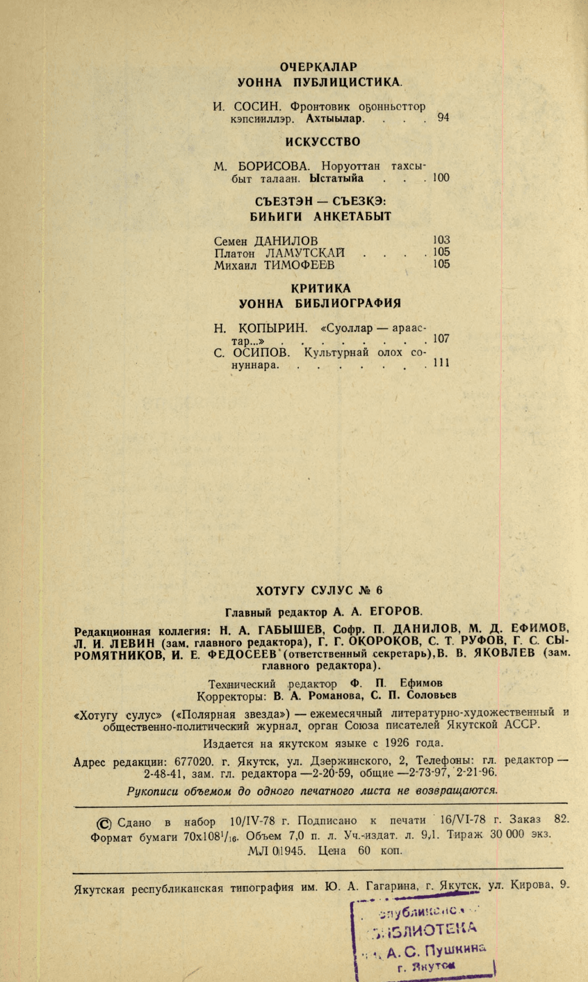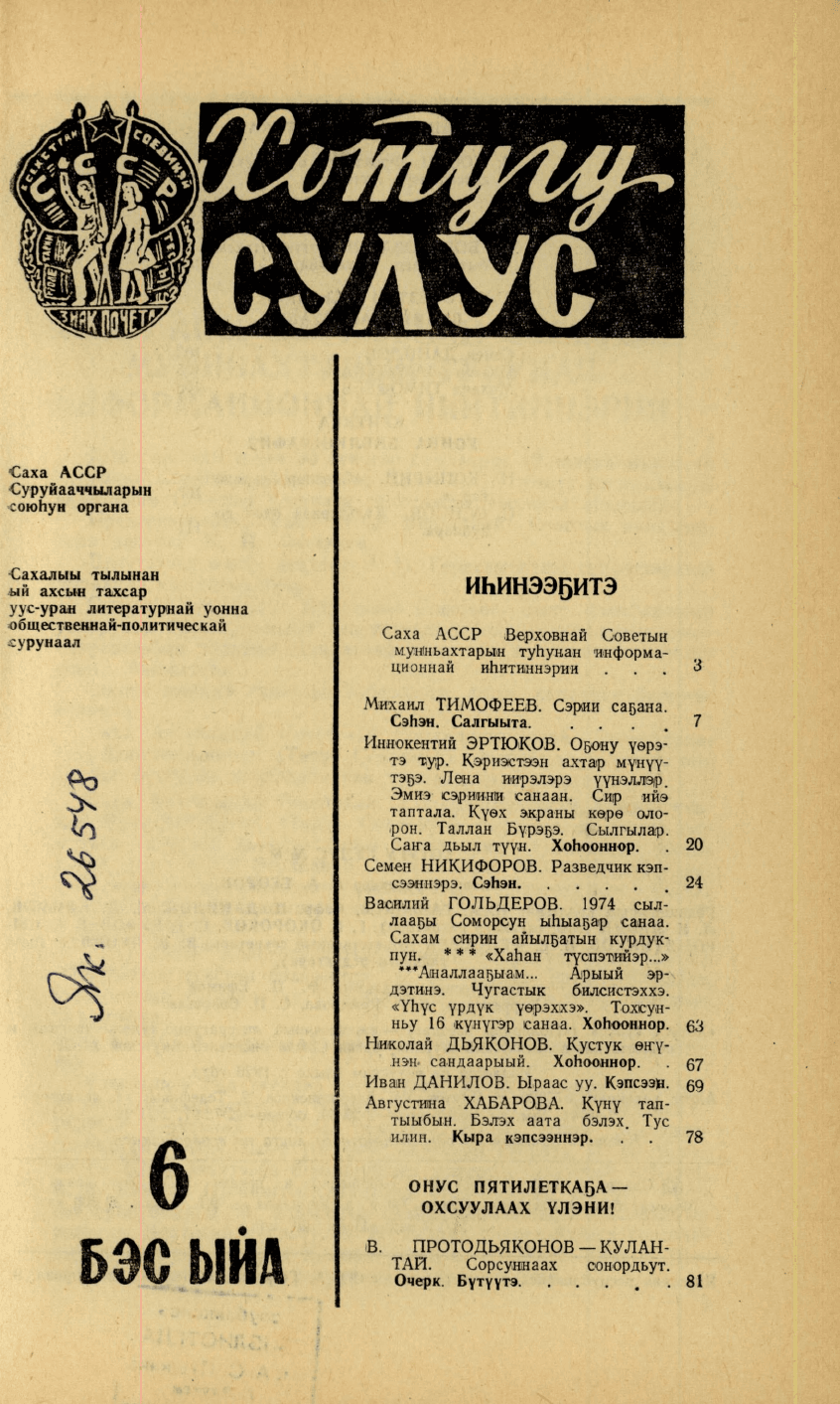 Хотугу сулус : [сахалыы тылынан уус-уран литературнай уонна общественно-политическай сурунаал] / САССР советскай суруйааччыларын союһа. - Якутскай : Саха сиринээҕи кинигэ издательствота, 1940-1989. 1978, N 6. - 1978. - 111, [1] с.