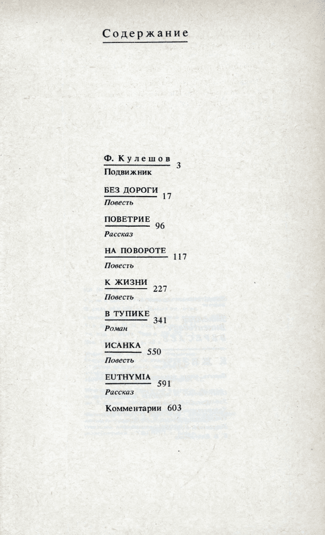 В книгу известного русского советского писателя В. В. Вересаева (1867—1945) вошли произведения, давно не публиковавшиеся — повести о судьбах русской интеллигенции в конце XIX — начале XX века, ее отношении к революции и народу "Без дороги", "На повороте", "К жизни" и роман "В тупике", являющийся одной из первых попыток в нашей литературе без прикрас создать объемное повествование о гражданской войне. Борьба идей, мировоззренческий конфликт составляют основу и таких произведений Вересаева, как повесть о трудной любви студентов Исанки и Бориса ("Исанка") и рассказ "Euthymia" — также о любви, о философии преодоления страдания