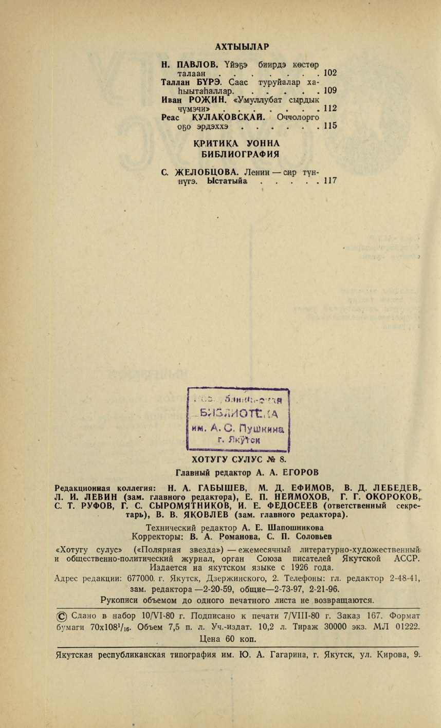 Хотугу сулус : [сахалыы тылынан уус-уран литературнай уонна общественно-политическай сурунаал] / САССР советскай суруйааччыларын союһа. - Якутскай : Саха сиринээҕи кинигэ издательствота, 1940-1989. 1980, N 8. - 1980. - 119, [1] с.