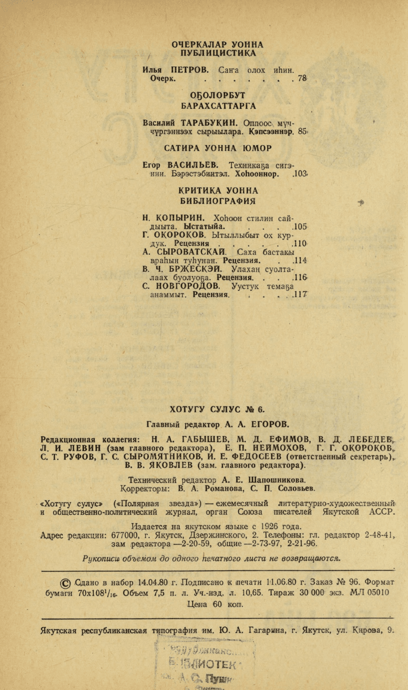 Хотугу сулус : [сахалыы тылынан уус-уран литературнай уонна общественно-политическай сурунаал] / САССР советскай суруйааччыларын союһа. - Якутскай : Саха сиринээҕи кинигэ издательствота, 1940-1989. 1980, N 6. - 1980. - 119, [1] с.