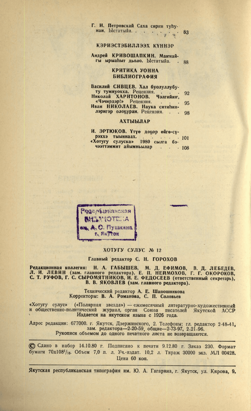 Хотугу сулус : [сахалыы тылынан уус-уран литературнай уонна общественно-политическай сурунаал] / САССР советскай суруйааччыларын союһа. - Якутскай : Саха сиринээҕи кинигэ издательствота, 1940-1989. 1980, N 12. - 1980. - 111, [1] с.