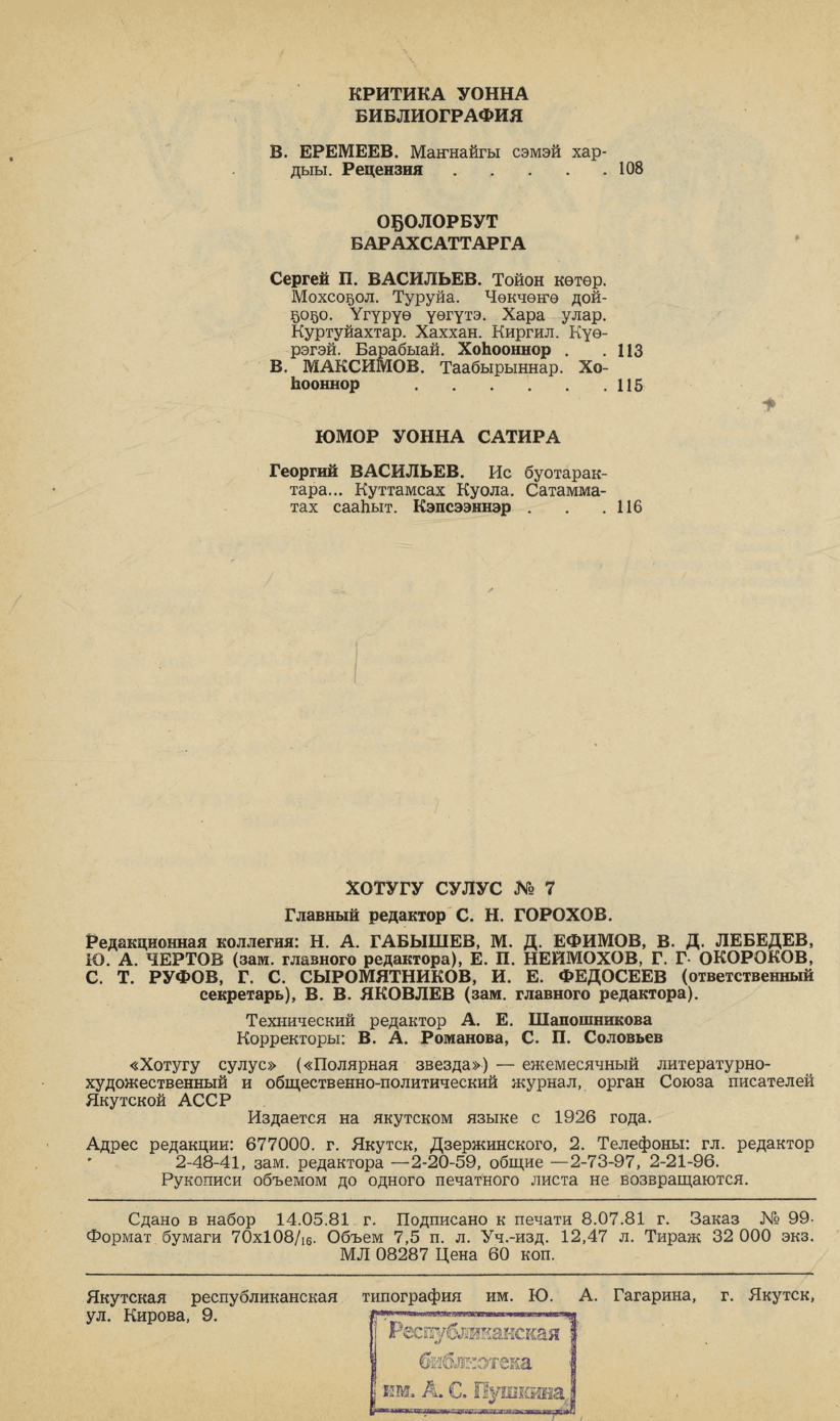 Хотугу сулус : [сахалыы тылынан уус-уран литературнай уонна общественно-политическай сурунаал] / САССР советскай суруйааччыларын союһа. - Якутскай : Саха сиринээҕи кинигэ издательствота, 1940-1989. 1981, N 7. - 1981. - 119, [1] с.