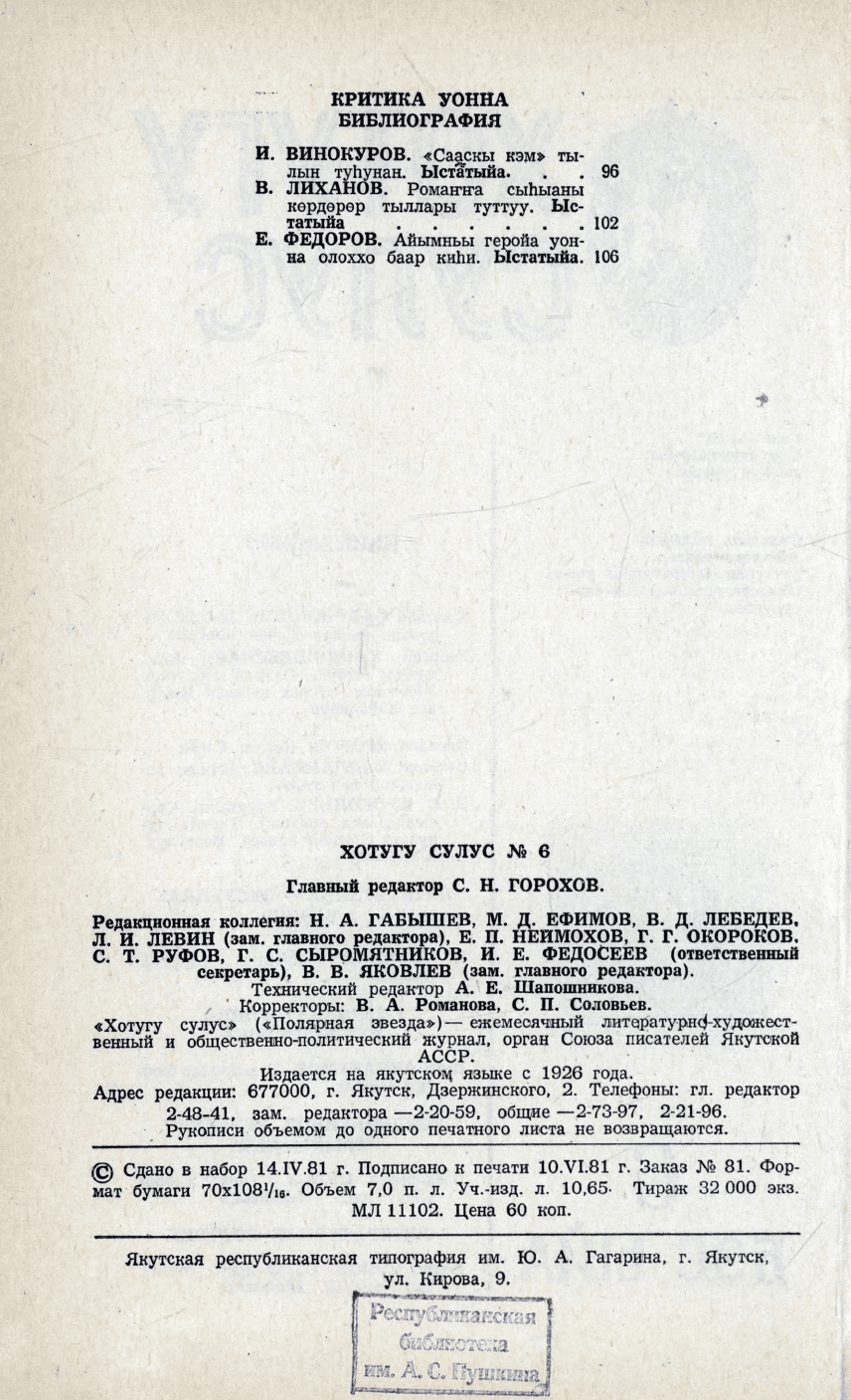 Хотугу сулус : [сахалыы тылынан уус-уран литературнай уонна общественно-политическай сурунаал] / САССР советскай суруйааччыларын союһа. - Якутскай : Саха сиринээҕи кинигэ издательствота, 1940-1989. 1981, N 6. - 1981. - 111, [1] с.