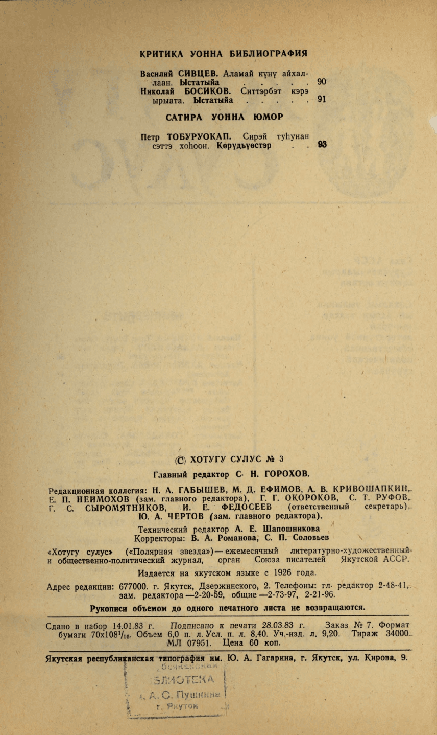 Хотугу сулус : [сахалыы тылынан уус-уран литературнай уонна общественно-политическай сурунаал] / САССР советскай суруйааччыларын союһа. - Якутскай : Саха сиринээҕи кинигэ издательствота, 1940-1989. 1983, N 3. - 1983. - 95, [1] с.