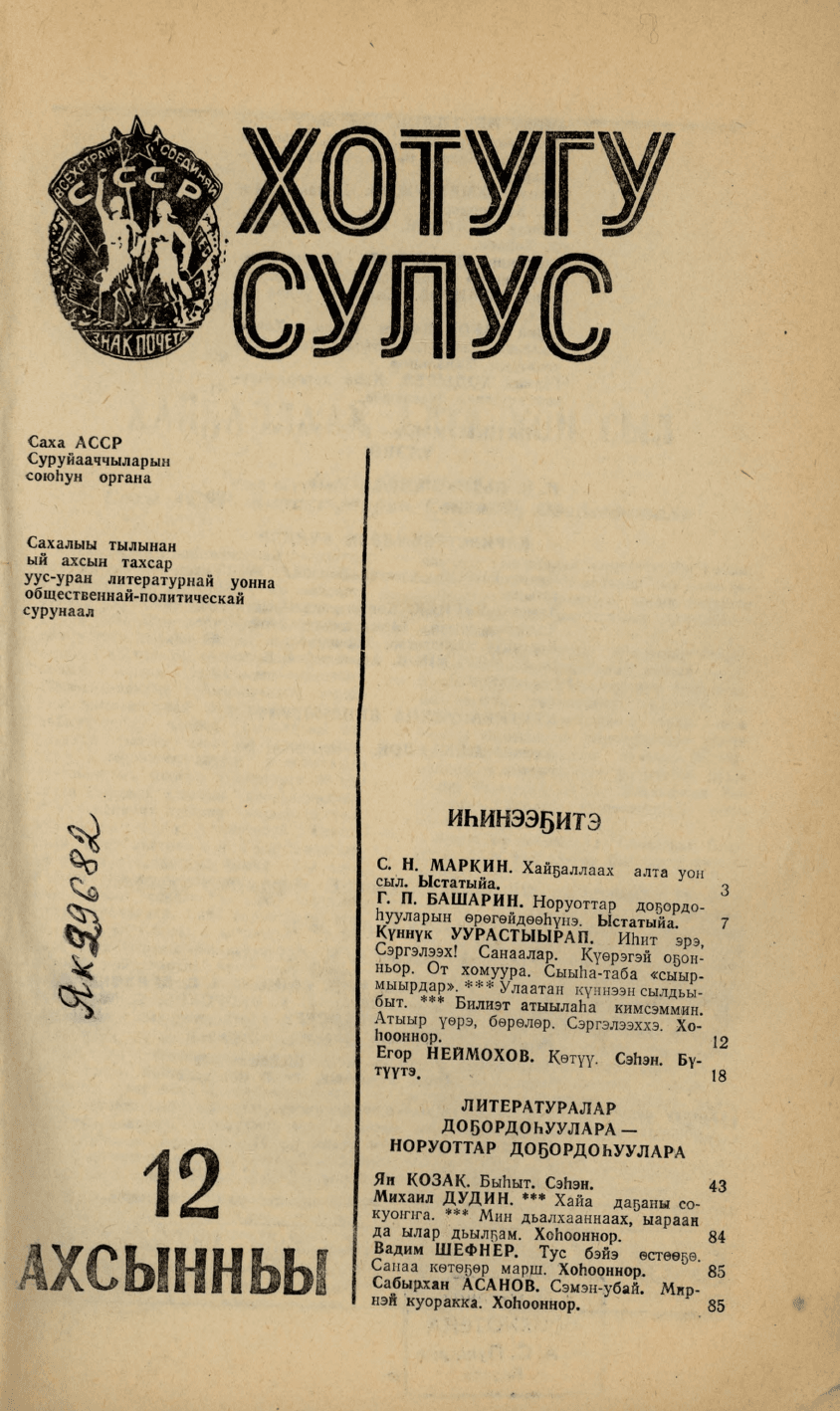 Хотугу сулус : [сахалыы тылынан уус-уран литературнай уонна общественно-политическай сурунаал] / САССР советскай суруйааччыларын союһа. - Якутскай : Саха сиринээҕи кинигэ издательствота, 1940-1989. 1982, N 12. - 1982. - 111, [1] с.