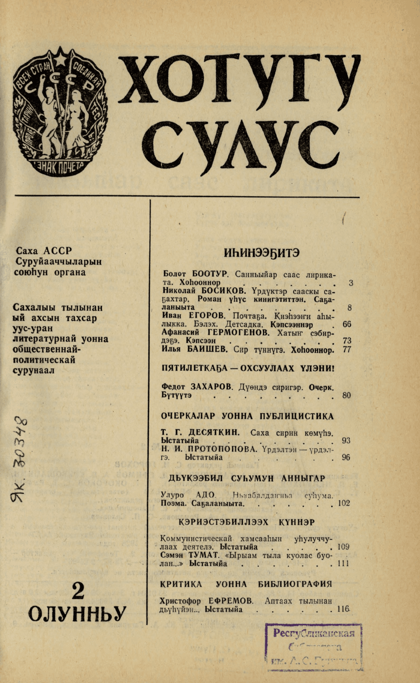 Хотугу сулус : [сахалыы тылынан уус-уран литературнай уонна общественно-политическай сурунаал] / САССР советскай суруйааччыларын союһа. - Якутскай : Саха сиринээҕи кинигэ издательствота, 1940-1989. 1984, N 2. - 1984. - 119, [1] с.