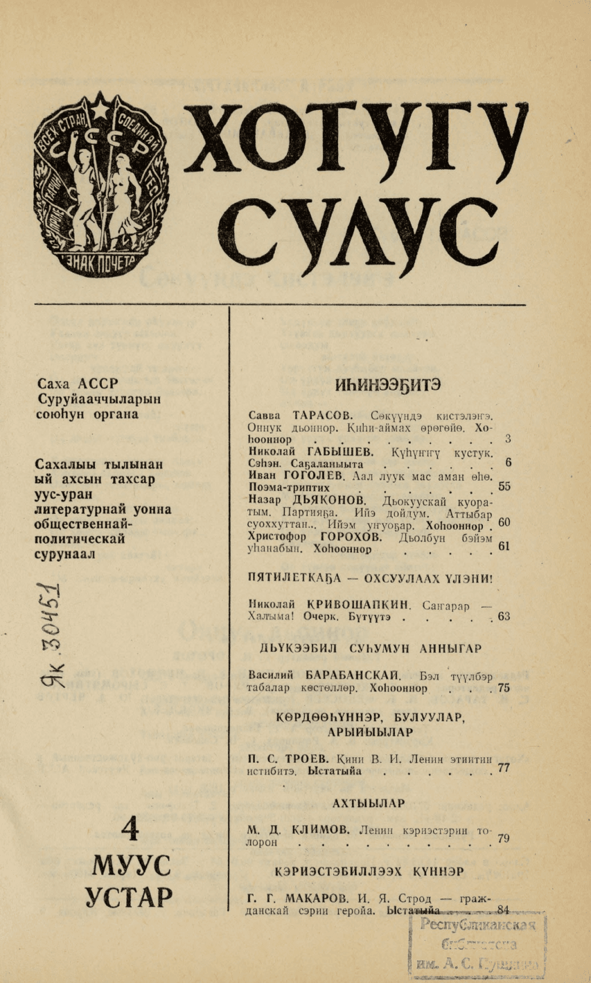 Хотугу сулус : [сахалыы тылынан уус-уран литературнай уонна общественно-политическай сурунаал] / САССР советскай суруйааччыларын союһа. - Якутскай : Саха сиринээҕи кинигэ издательствота, 1940-1989. 1984, N 4. - 1984. - 95, [1] с.