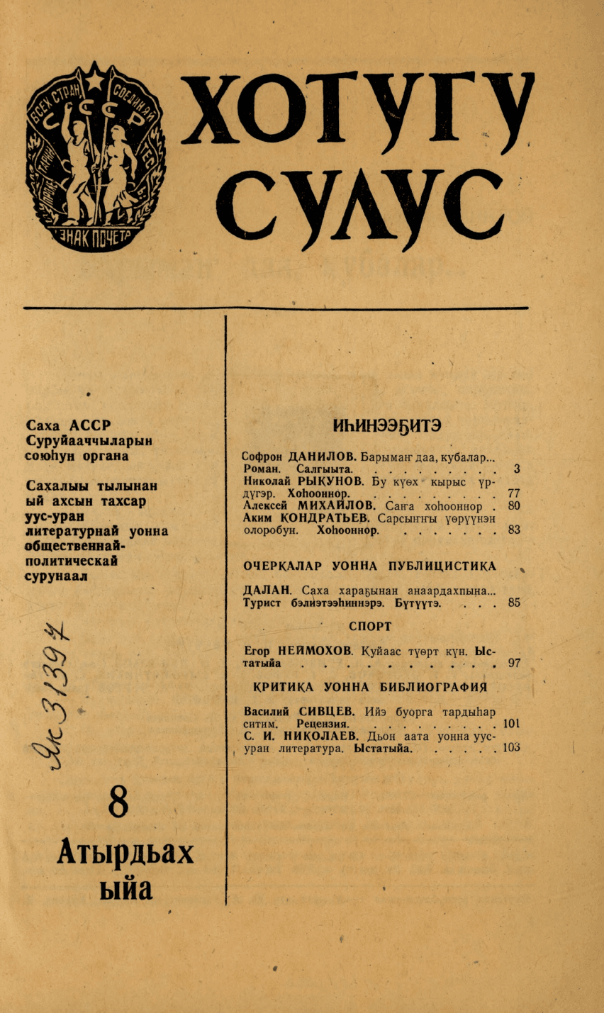Хотугу сулус : [сахалыы тылынан уус-уран литературнай уонна общественно-политическай сурунаал] / САССР советскай суруйааччыларын союһа. - Якутскай : Саха сиринээҕи кинигэ издательствота, 1940-1989.