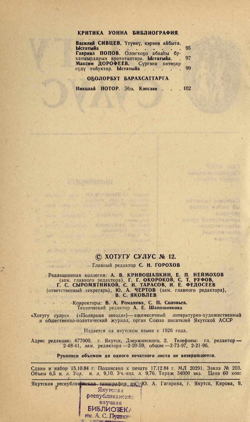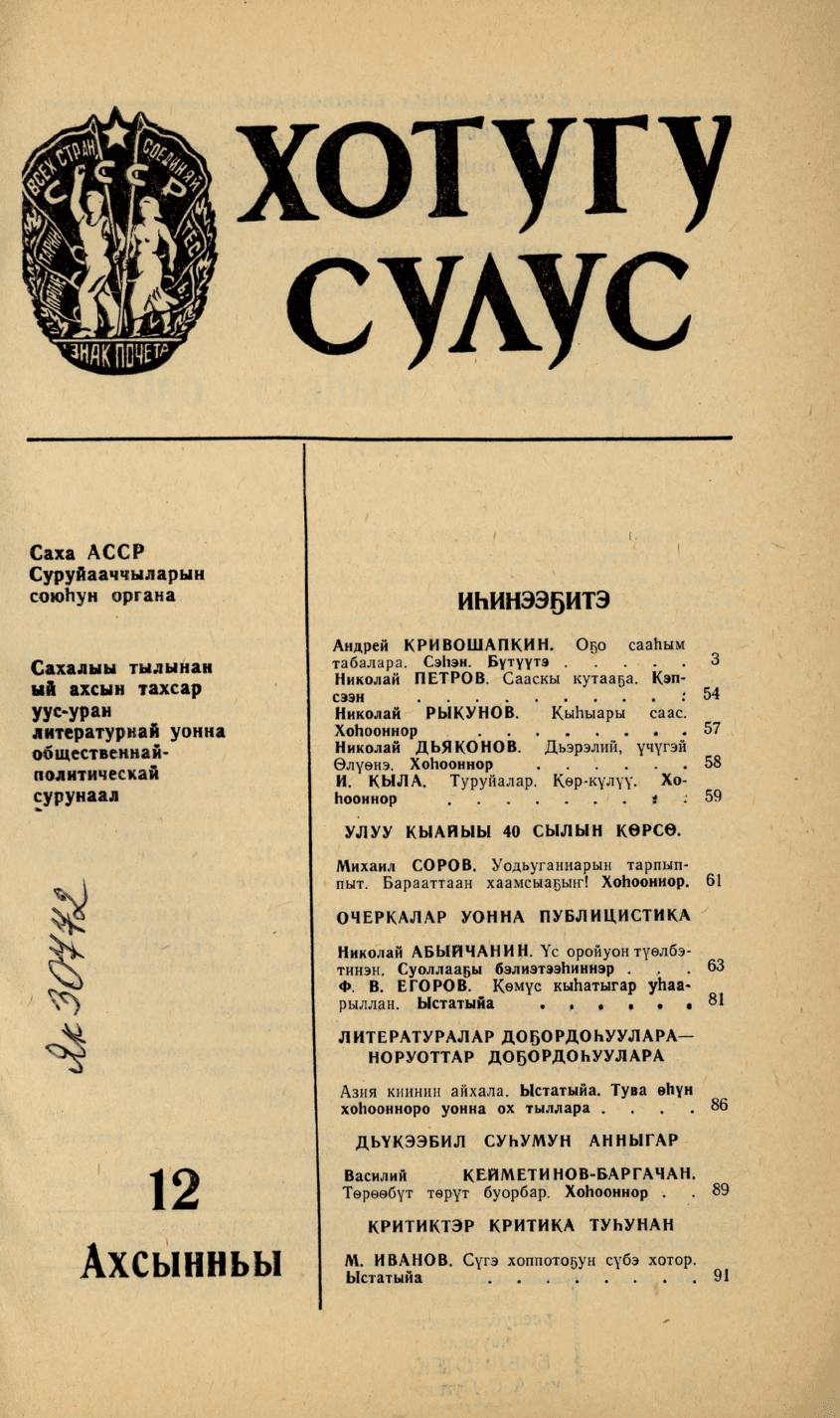 Хотугу сулус : [сахалыы тылынан уус-уран литературнай уонна общественно-политическай сурунаал] / САССР советскай суруйааччыларын союһа. - Якутскай : Саха сиринээҕи кинигэ издательствота, 1940-1989. 1984, N 12. - 1984. - 103, [1] с.