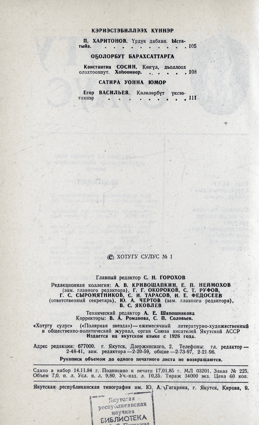 Хотугу сулус : [сахалыы тылынан уус-уран литературнай уонна общественно-политическай сурунаал] / САССР советскай суруйааччыларын союһа. - Якутскай : Саха сиринээҕи кинигэ издательствота, 1940-1989. 1985, N 1. - 1985. - 103, [1] с.