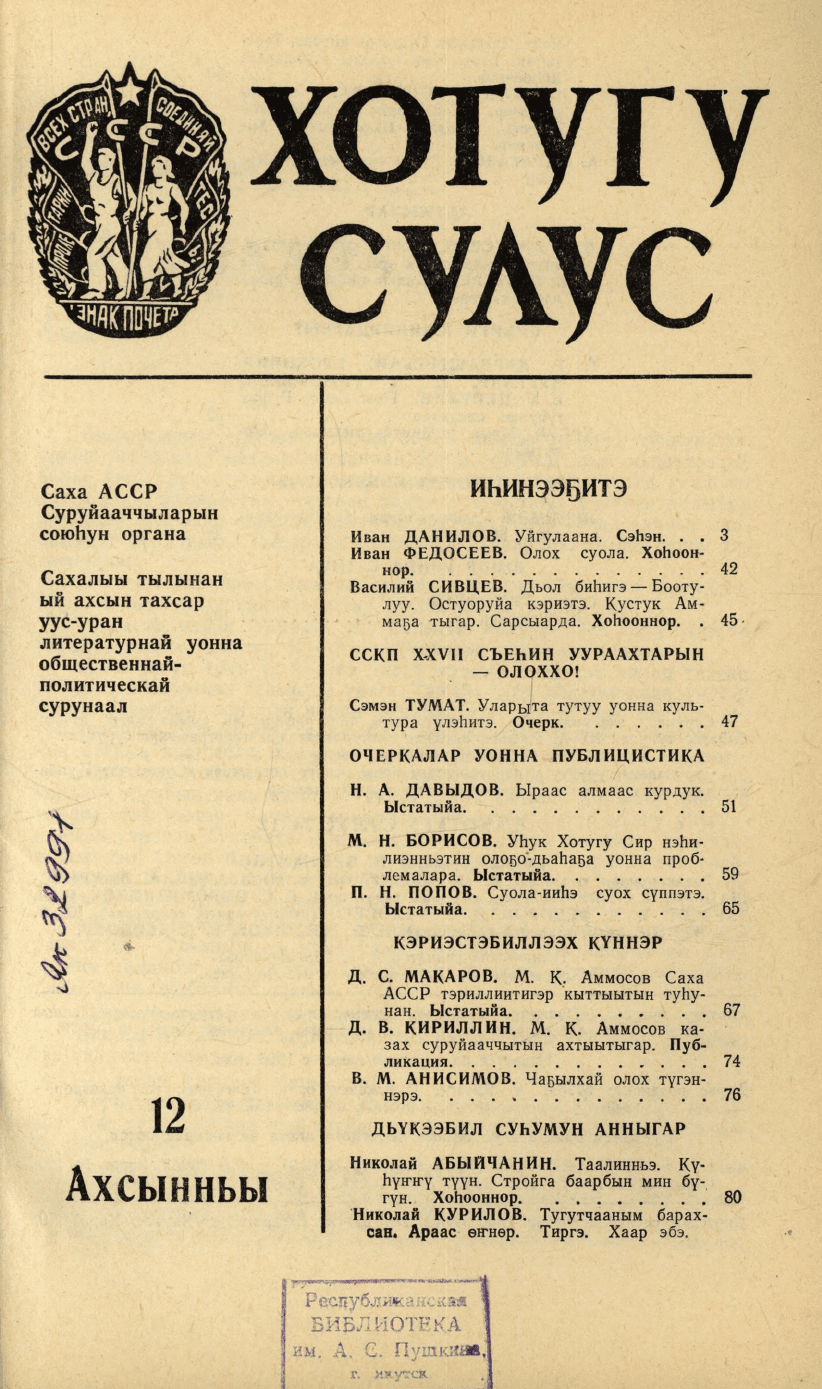 Хотугу сулус : [сахалыы тылынан уус-уран литературнай уонна общественно-политическай сурунаал] / САССР советскай суруйааччыларын союһа. - Якутскай : Саха сиринээҕи кинигэ издательствота, 1940-1989. 1987, N 12. - 1987. - 103, [1] с.