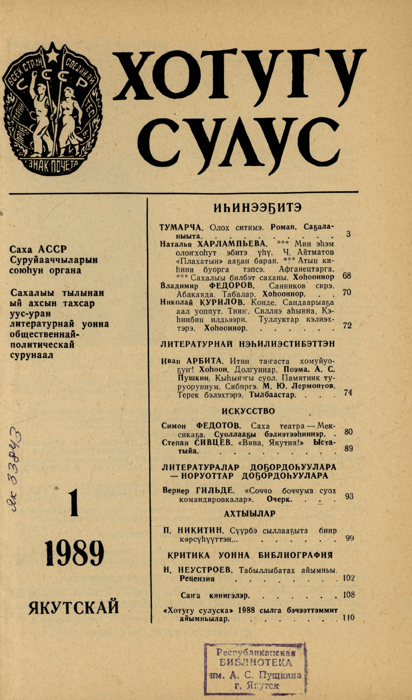 - 2. Хотугу сулус: [сахалыы тылынан уус-уран литературнай. уонна общественно-политическай сурунаал], 1989, №3