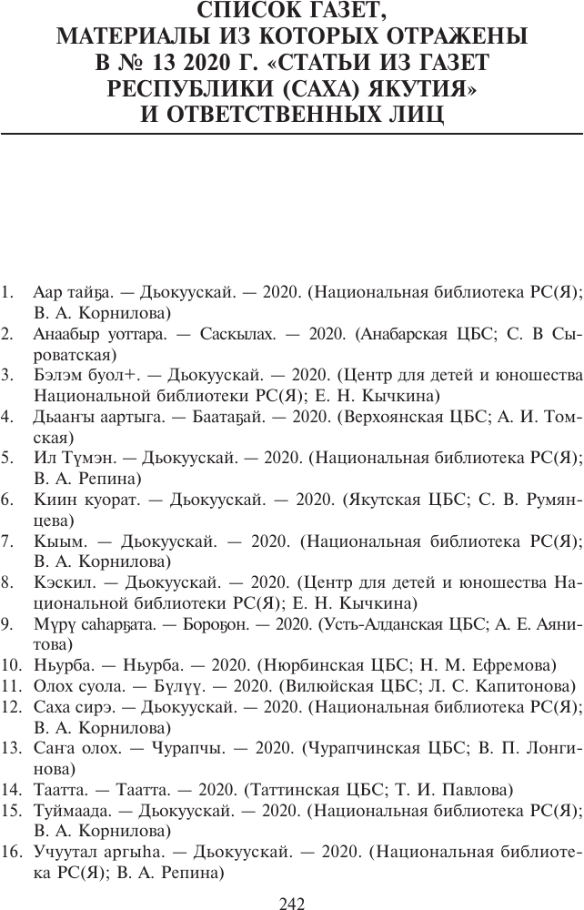 Статьи из газет Республики Саха (Якутия) : государственный библиографический указатель = Саха Өрөспүүбүлүкэтин хаһыаттарыгар киирбит ыстатыйалар : судаарыстыбаннай библиографическай ыйынньык / Министерство культуры и духовного развития Республики Саха (Якутия), Национальная библиотека Республики Саха (Якутия), Центр обеспечения информационными ресурсами. - Электрон. дан. - Якутск : СРИД НБ РС(Я), 2018- . 2020, N 13 (15790-17148). - Компьютерный файл (1 файл : 5,65 Мб). - 2020. - 245, [1] с.