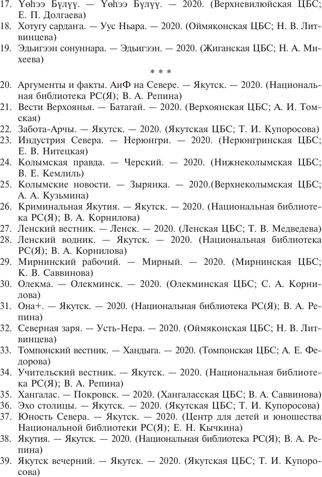 2020, N 24 (31331-32543), 2021, №N 24 (31331-32543) - 6. Статьи из газет Республики Саха (Якутия) = Саха Өрөспүүбүлүкэтин хаһыаттарыгар киирбит ыстатыйалар: государственный библиографический указатель