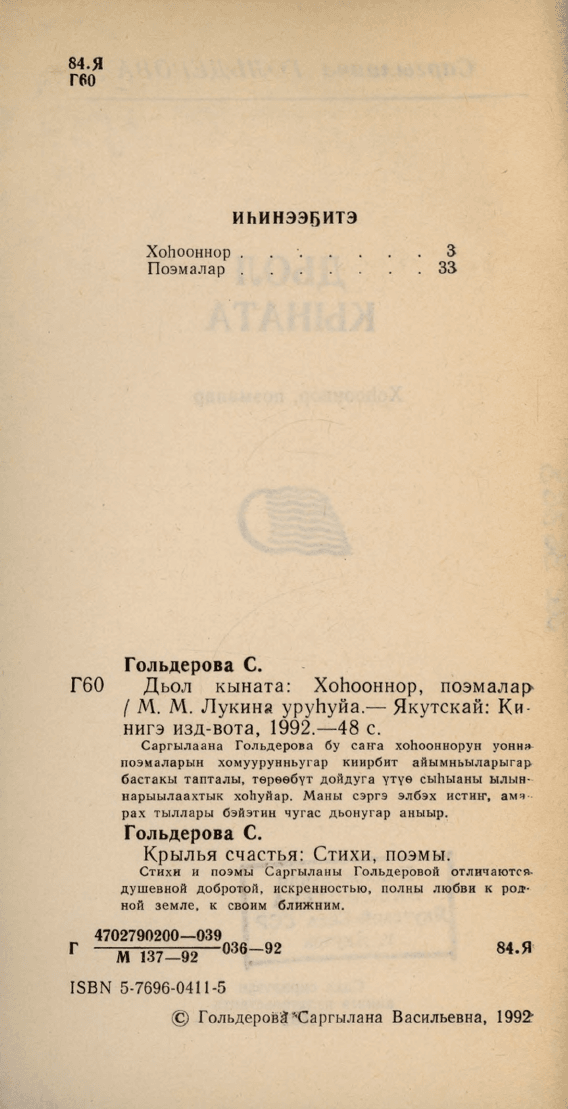 Дьол кыната : хоһооннор, поэмалар / Саргылаана Гольдерова ; [художник М. М. Лукина]. - Якутскай : Саха сиринээҕи кинигэ издательствота, 1992. - 47, [1] с.