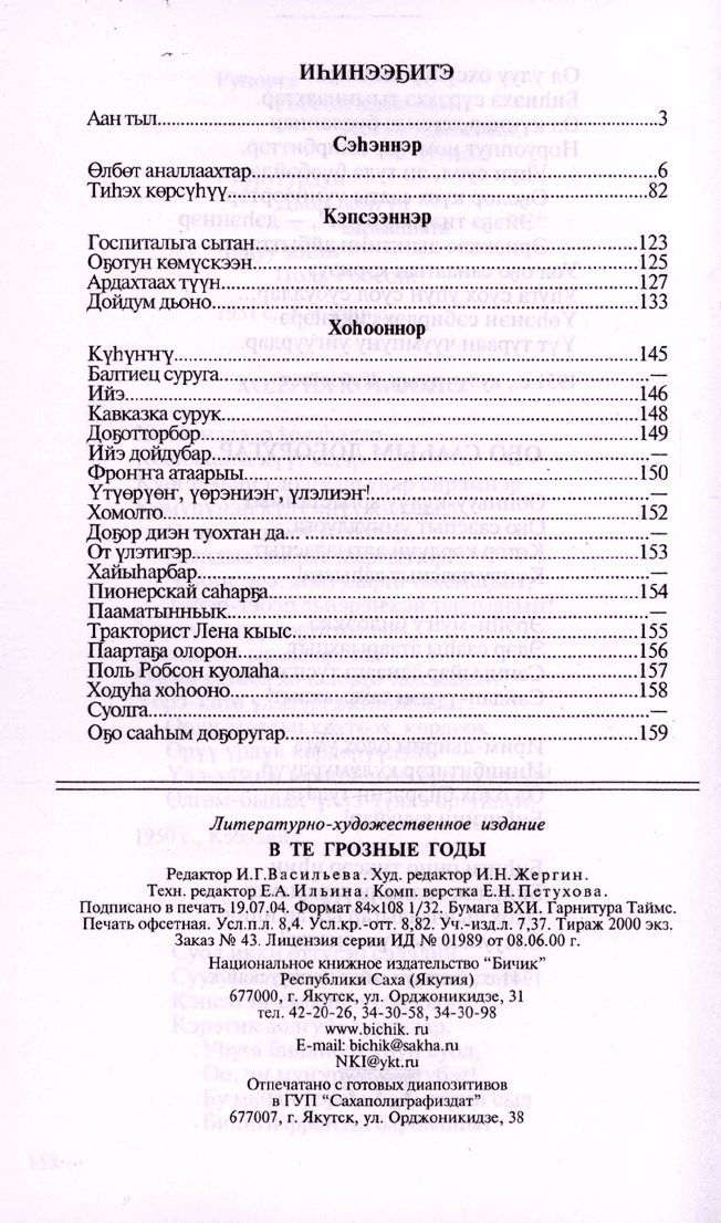 Ол ыар сыллар : сэһэннэр, кэпсээннэр, хоһооннор : [кыайыы 60 сылын көрсө] / Семен Никифоров ; [хомуйан оҥордо уонна аан тылын суруйда А. И. Аржаков]. - Дьокуускай : Бичик, 2004. - 158, [1] с.
