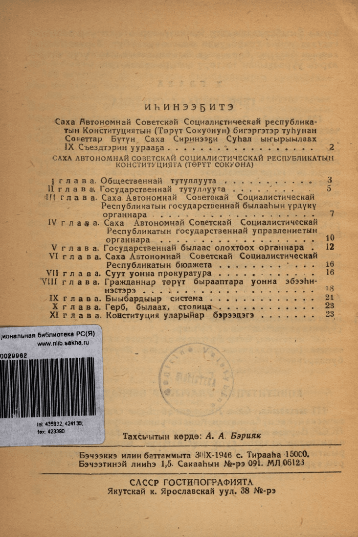 Конституция. Саха Автонономнай Советскай Социалистическай Республикатын Конституцията (төрүт сокуона) : Саха АССР Верховнай советын 2-с, 3-с, 4-с уонна 9-с сессияларыгар ылыллыбыт уларыйыылары уонна эбиилэри киллэриллиннэ / [ред. А. А. Бэрияк]. - Якутскай : САССР Госиздата, 1946. - 22, [2] с.