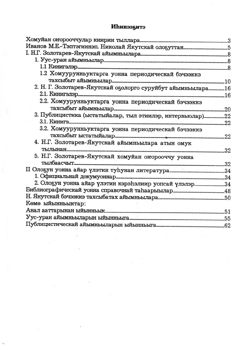 Саха сирин народнай суруйааччыта Николай Гаврилович Золотарев-Николай Якутскай (1908-1995) : биобиблиографическай ыйынньык / Саха Республикатын Национальнай бибиотеката, Үөһээ Бүлүүтээҕи киин библиотека ; [хомуйан оҥордулар: Л. Г. Федорова, И. И. Аргунова, Г. А. Егорова ; редактор Я. А. Захарова ; киирии тыл автора М. Е. Иванов-Тэптэгиинэп]. - Дьокуускай : НБ РС(Я), 2008. - 65, [1] с.