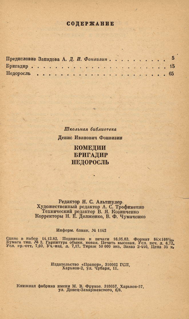 Комедии / Д. И. Фонвизин ; [Предисл. и примеч. А. Западова ; Худож. И. А. Вышинский]. - Харьков : Прапор, 1983. - 127 с.