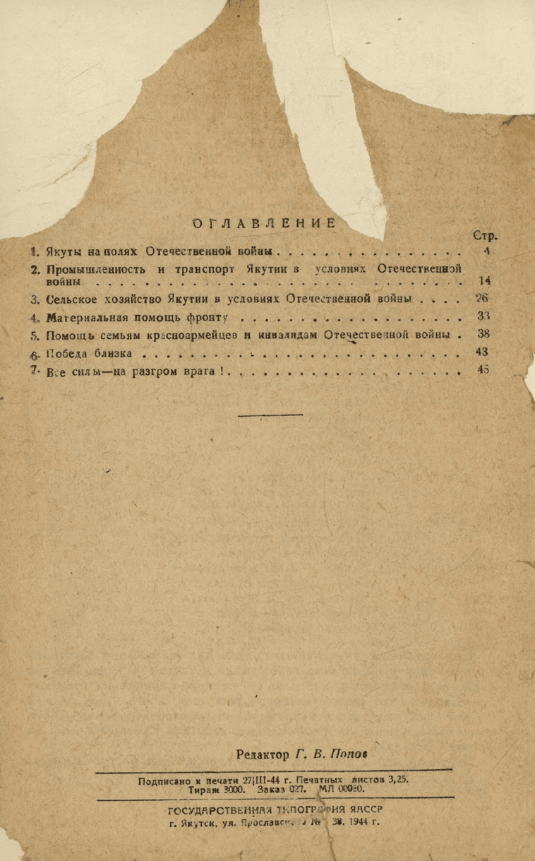 Якутия в Великой Отечественной войне Советского Союза / А. Мординов ; Якутский государственный педагогический институт, Кафедра основ марксизма-ленинизма. - Якутск : Якутское государственное издательство, 1944. - 50, [2] с. - 3000 экз.