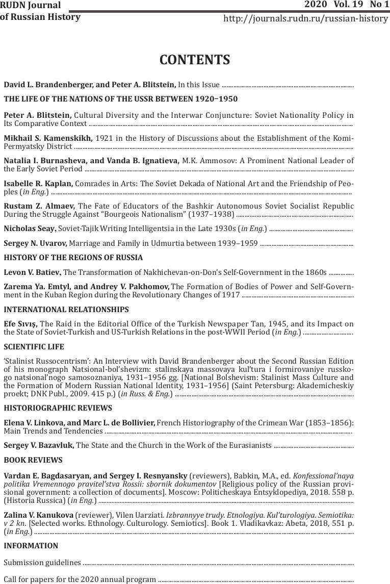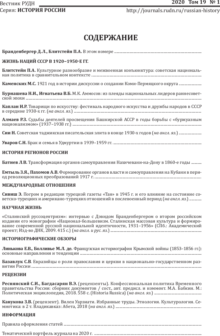 Вестник Российского университета дружбы народов. Серия: История России = RUDN Journal of Russian History : научный журнал / учредитель: Федеральное государственное автономное образовательное учреждение высшего образования "Российский университет дружбы народов" ; редакционная коллегия: главный редактор Мосейкина Марина Николаевна [и др.]. – 2002, N 1- . – Москва : Российский университет дружбы народов, 2002- 4 выпуска в год: февраль, май, август, ноябрь. – ISSN 2312-8674 (print). - ISSN 2312-8690 (online). - DOI 10.22363/2312-8674-2020-19-1. - 2020, т. 19, N 1, февраль : Жизнь наций СССР в 1920−1950-е гг. – 284 с.