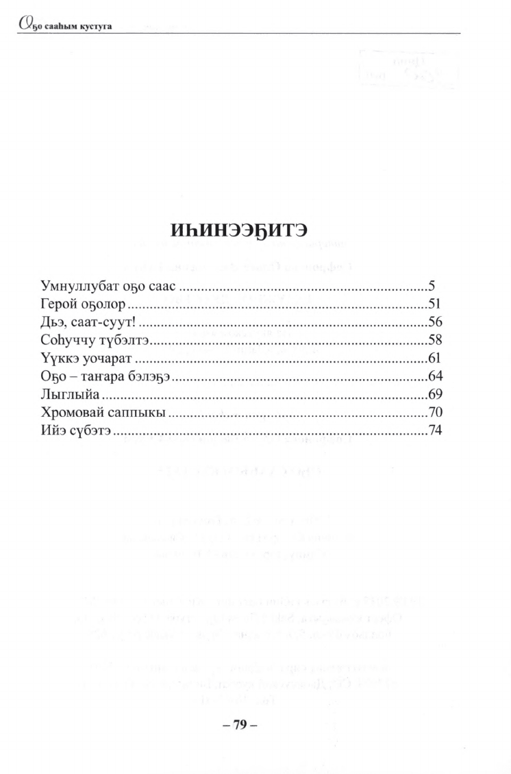 Оҕо сааһым кустуга : [кэпсээннэр] / Ольга Софронова-Суһум ; [аан тыл авт. Муттуххай Бороҥ ; худуоһунньук Александр Попов]. - Дьокуускай : Дани-Алмас, 2017. - 79 с.