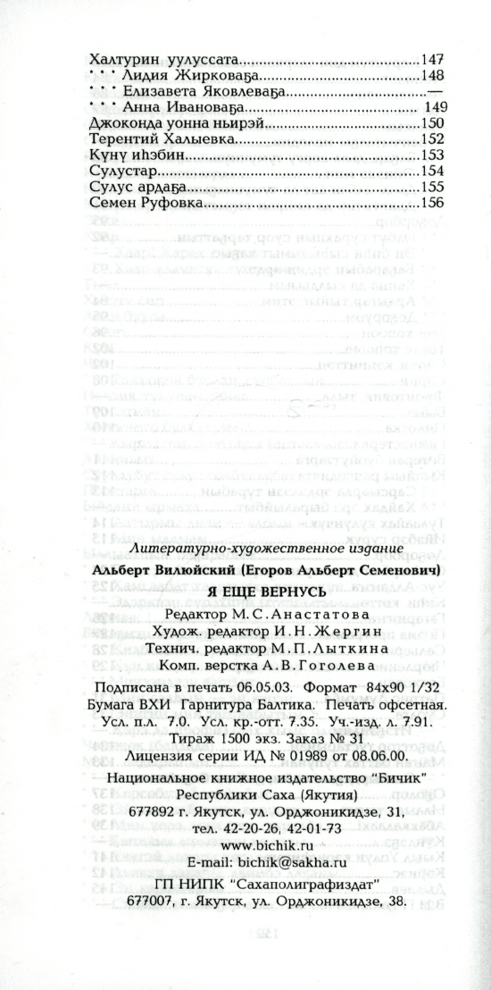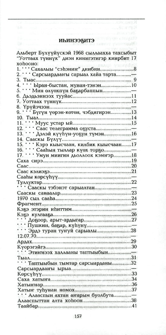 В книге талантливого якутского поэта Альберта Вилюйского (А.С. Егоров, 1943—1979 гг.) собраны почти все его стихотворения, многие из которых раньше не были опубликованы