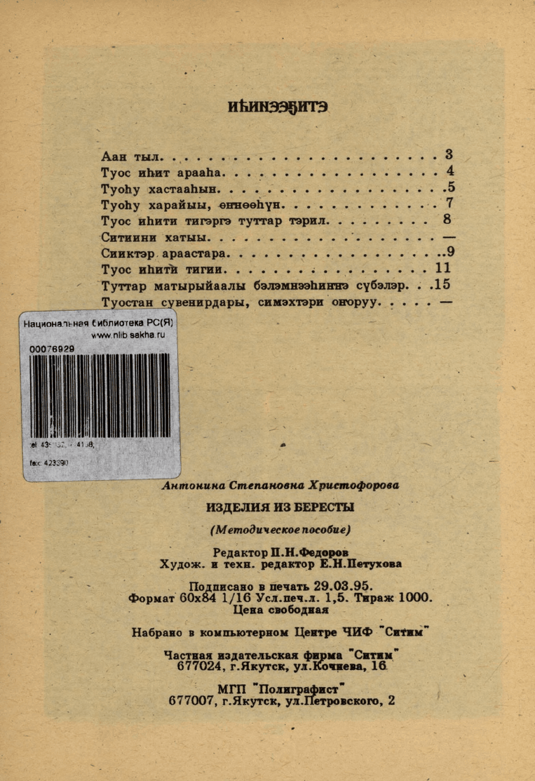 Народная мастерица из Сунтарского улуса в последние годы занимается возрождением традиционных изделий якутов из бересты. Изготовленные ею сувениры, предметы утвари, разные украшения пользуются спросом. В пособии даются краткие советы начинающим мастерам