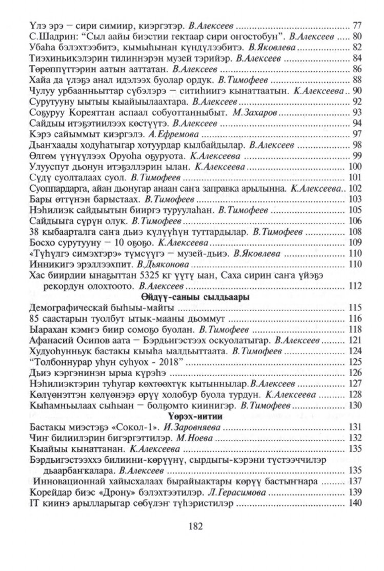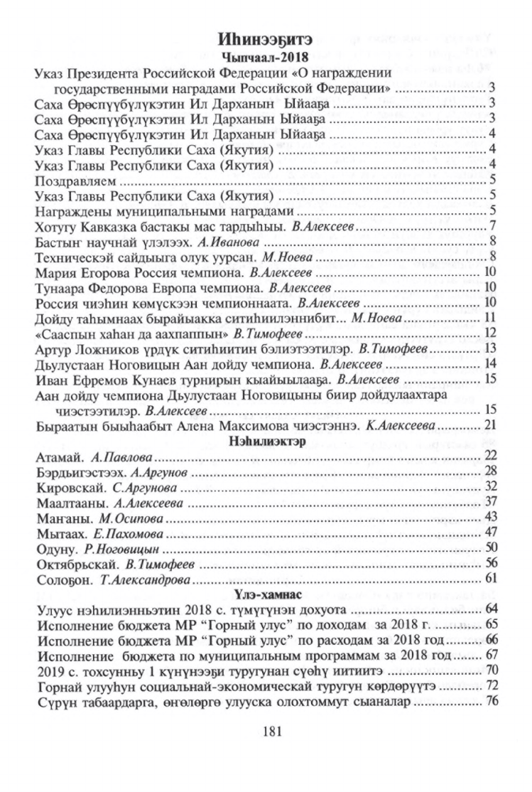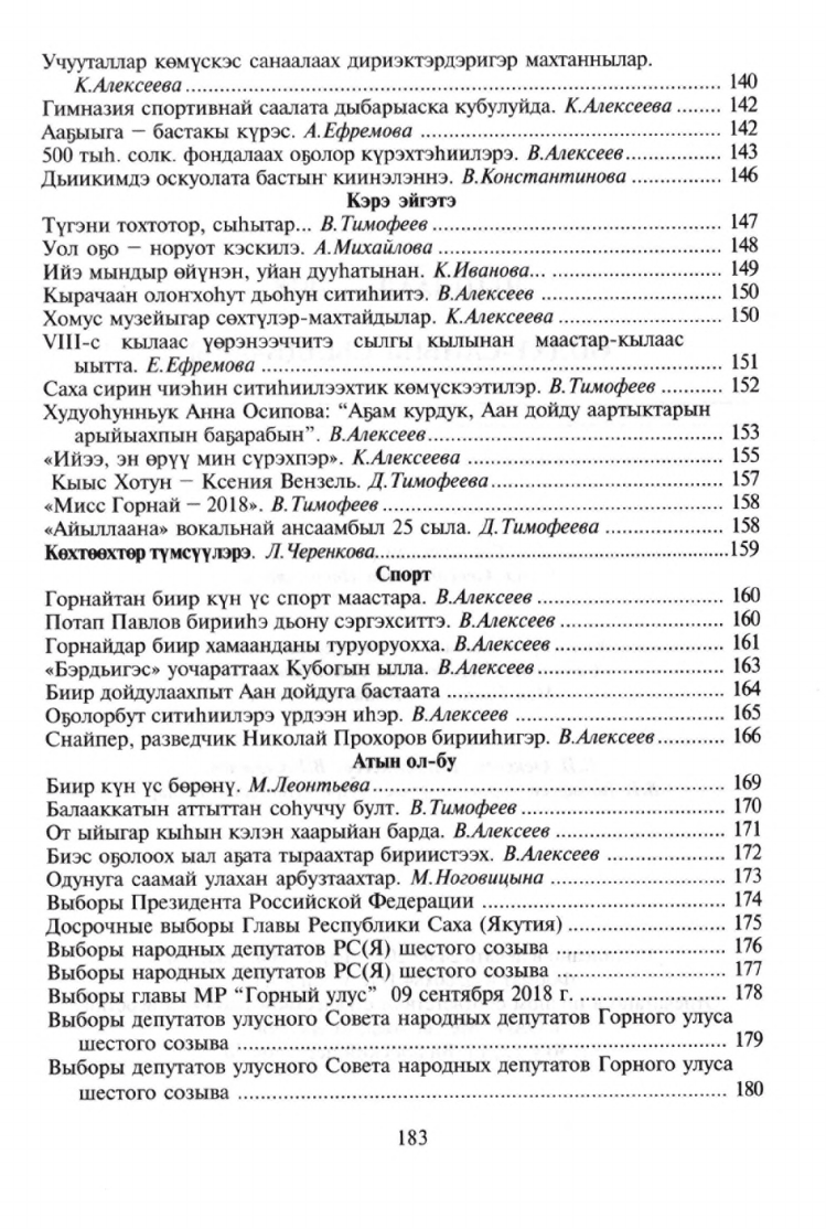 "Чыпчаал" - 2018. Өйдүү-саныы сылдьаары / Саха Өрөспүүбүлүкэтин Горнай улууһунааҕы "Үлэ күүһэ" хаһыат редакцията ; [В. И. Алексеев идеятынан, бэчээккэ бэлэмнээһининэн, редакциялааһынынан ; хомуйан оҥордулар: В. И. Алексеев, Е. А. Пономарева]. - Бэрдьигэстээх : "Үлэ күүһэ" хаһыат редакцията, 2019 (Дьокуускай : Медиа-холдинг Якутия). - 183 с.