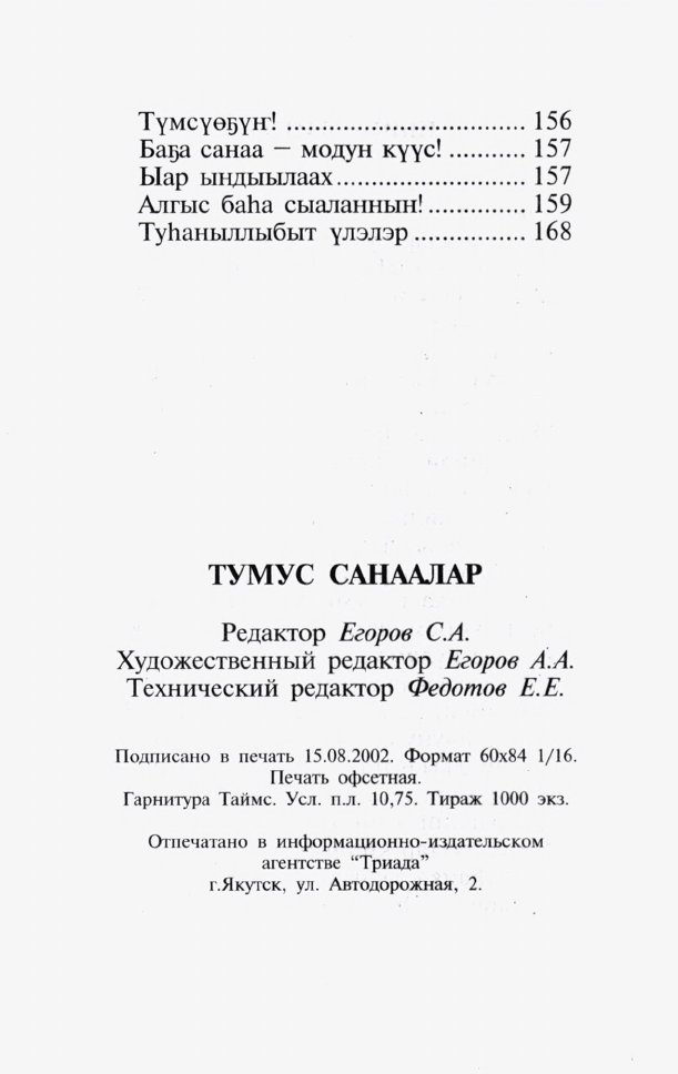 Тумус санаалар / [хомуйан оҥордо В. В. Семенова ; художник А. А. Егоров]. - Дьокуускай : [и. с.], 2002. - 169, [3] с.