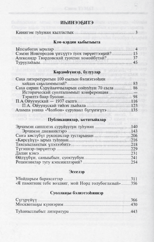 В книге якутского писателя, заслуженного работника культуры РС (Я), лауреата Государственной премии им. П. А. Ойунского С. А. Попова-Сэмэн Тумата рассматриваются вопросы якутской литературы