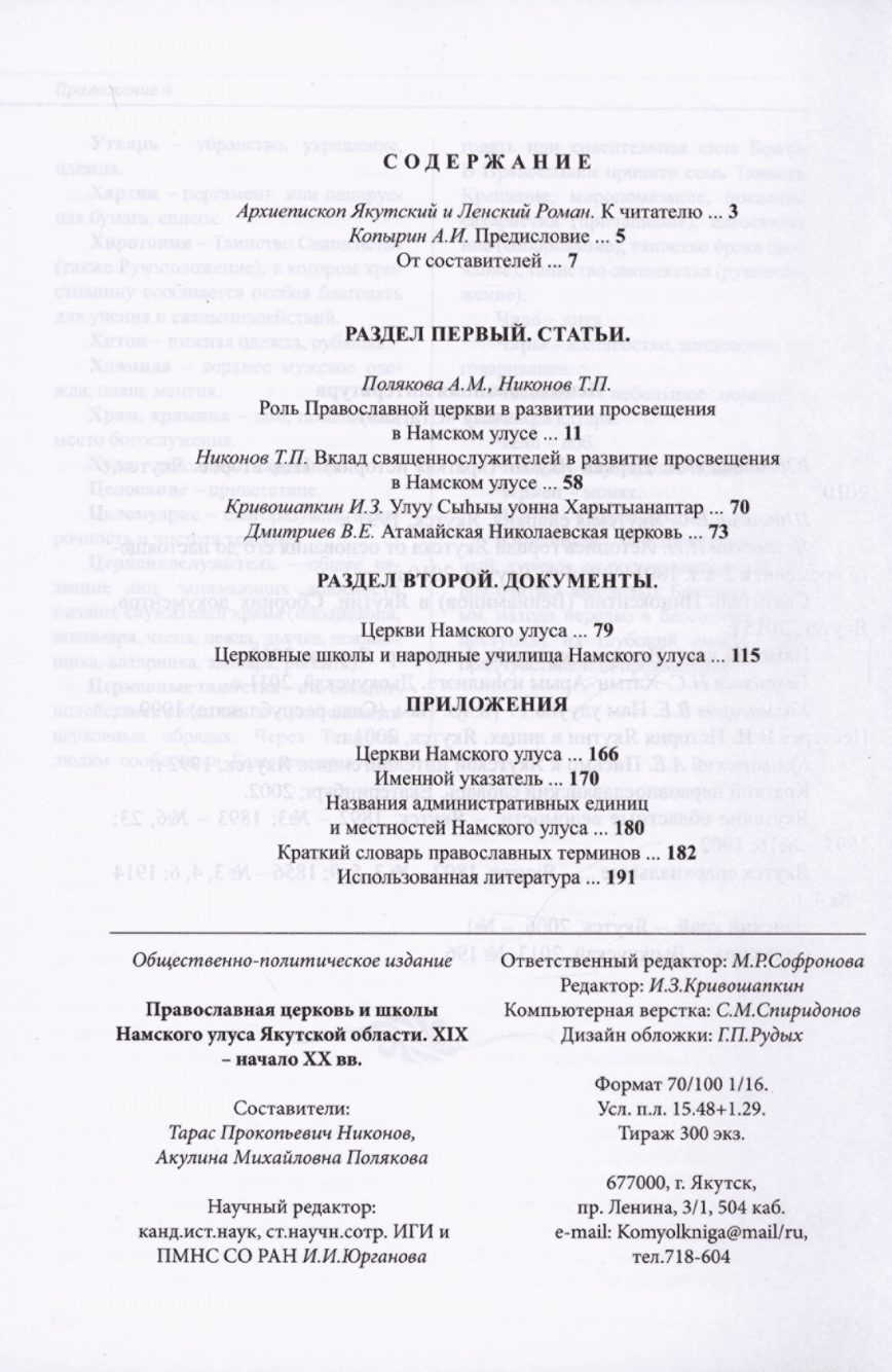 Православная церковь и школы Намского улуса Якутской области XIX-начало ХХ вв. : (статьи и документы) / МО "Нам. улус", МБУ "Нам. историко-этногр. музей им. П. И. Сивцева", Нам. центр. улус. б-ка им. Н. М. Рыкунова ; [составители: Т. П. Никонов, А. М. Полякова ; редактор И. З. Кривошапкин ; предисловие А. И. Копырин]. - Якутск : Көмүөл, 2016. - 190, [2] с., [16] л. цв. ил.