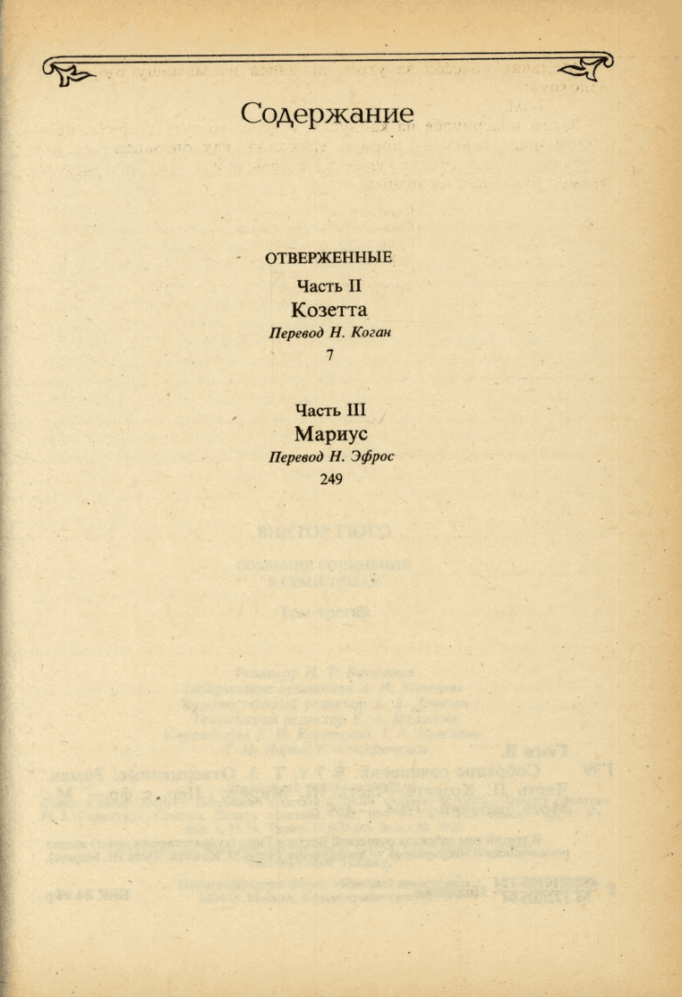 Собрание сочинений : в 7 т. : [перевод с французского] / Виктор Гюго. - Москва : Московский рабочий, 1993-. - 20 см. ISBN 5-239-01660-7. Т. 3: Отверженные : роман, Ч. 2. Козетта, Ч. 3. Мариус. - 1994. - 467, [2] с. ISBN 5-239-01686-0 (т. 3)