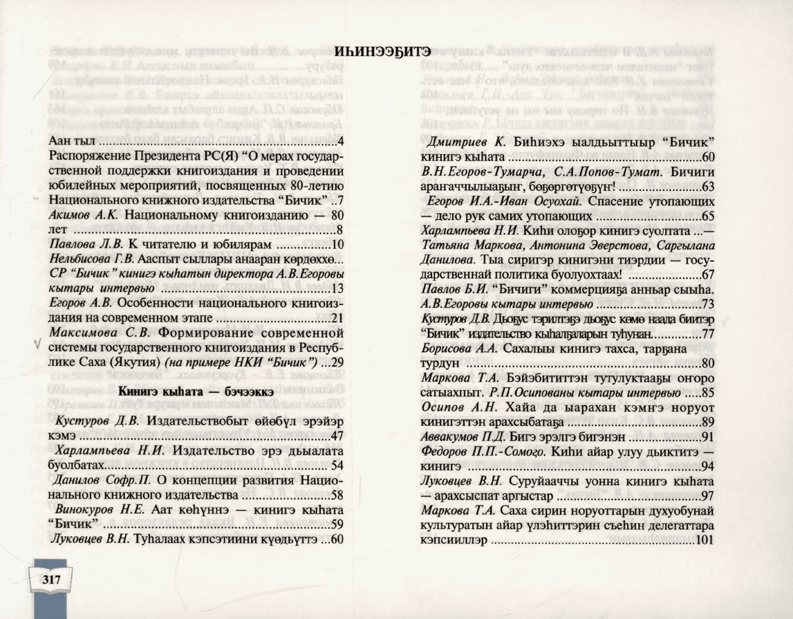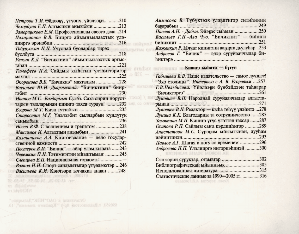 Саха сирин кинигэтин кыһата саҥа үйэҕэ : ["Бичик" кинигэ кыһата 80 сылыгар / хомуйан оҥордо В. Н. Луковцев]. - Дьокуускай : Бичик, 2006. - 317, [2] с., [12] л. ил.