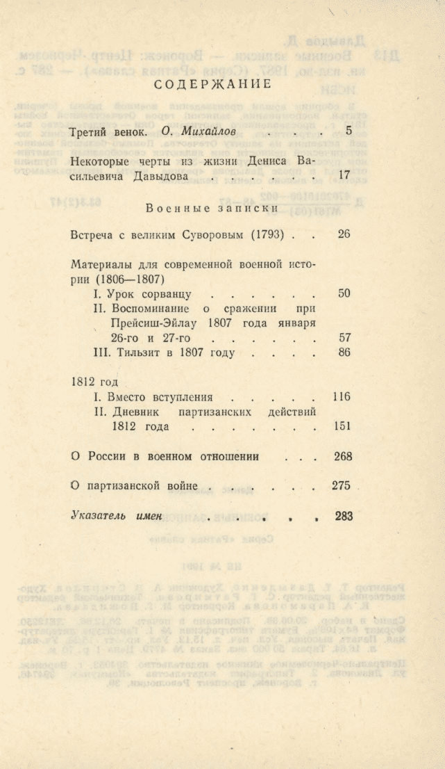 Военные записки / Денис Давыдов ; редкол.: А. М. Абрамов [и др.] ; вступительная статья О. Н. Михайлова. - Воронеж : Центрально-Черноземное книжное издательство, 1987. - 285, [2] с.