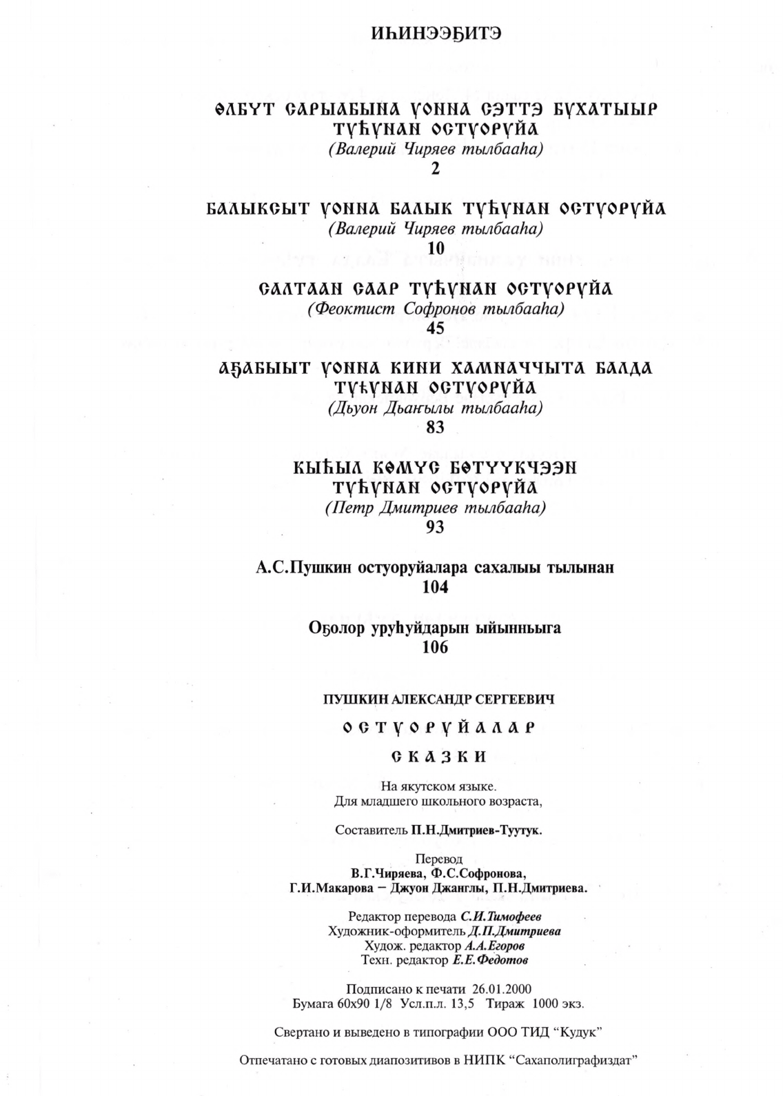 Остуоруйалар / А. С. Пушкин ; хомуйан оҥордо П. Н. Дмитриев-Туутук ; В. Г. Чиряев, Ф. С.