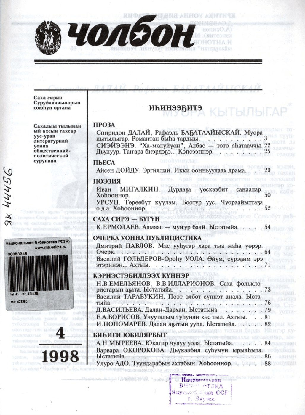- 3. Чолбон: уус-уран литературнай уонна общественнай-политическай сурунаал, 1998, №3